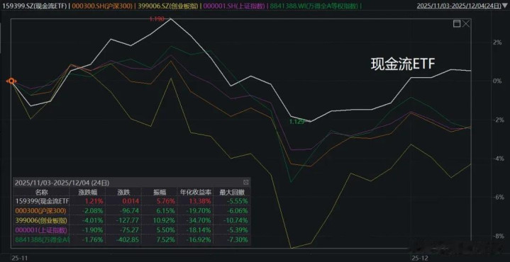 比如11月以来A股这波萎靡期,上证指数、沪深300、创业板指乃至全A等权指数,都有不同程度的下跌,而现金流ETF(159399)同期是逆势上涨的。毕竟它兼顾了进攻和防御属性,还每个月都能评估分红(2月底上市到现在已经连续9个月分红),比较契合配置型资金的诉求。